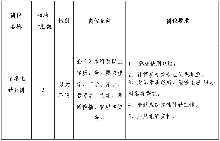 5.同等條件下,優(yōu)先招聘有相同工作經(jīng)驗(yàn)者、警察類或政法類院校畢業(yè)生、具有醫(yī)療救護(hù)等專業(yè)技能的人員、退役士兵、見義勇為積極分子和在職公安民警的配偶子女;