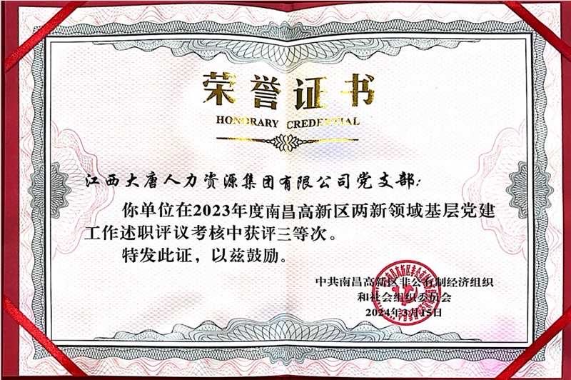 近日,中共南昌高新區(qū)非公有制經(jīng)濟組織和社會組織委員會印發(fā)的《2023年度南昌高新區(qū)非公有制經(jīng)濟組織和社會組織黨建工作考核結(jié)果的通報》,銀控集團旗下子公司—江西大唐人力資源集團有限公司黨支部獲評三等次榮譽。