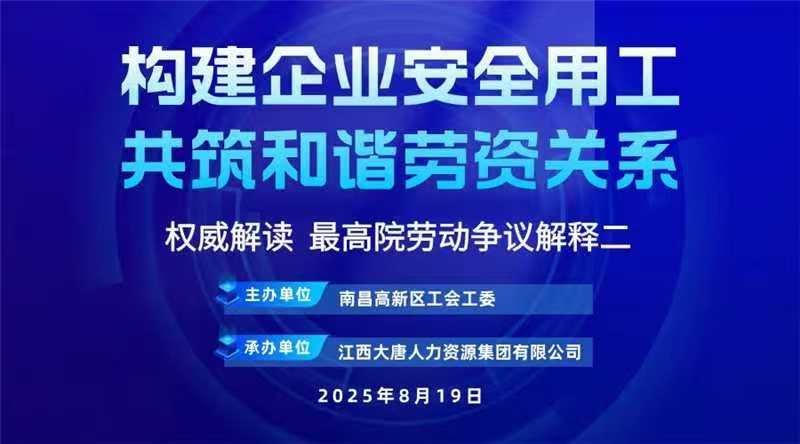 2025年8月19日下午,由南昌高新區(qū)工會(huì)工委主辦,江西銀控科技集團(tuán)有限公司旗下子公司江西大唐人力資源集團(tuán)有限公司承辦的“構(gòu)建企業(yè)安全用工 共筑和諧勞資關(guān)系”公益講座在我司培訓(xùn)中心成功舉行。此次活動(dòng)吸引了來自南昌市的40多位企業(yè)家及企業(yè)人力資源管理人員參與,共同探討企業(yè)用工風(fēng)險(xiǎn)及應(yīng)對(duì)策略。